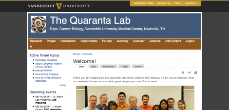 Project Highlight: Quaranta Lab![]() Project start/end dates: June, 2008 to January, 2011. Link: http://ccsb.vanderbilt.edu/qlab/. Highlights: Drupal 6 implementation, using CCK, Views, and custom modules. |