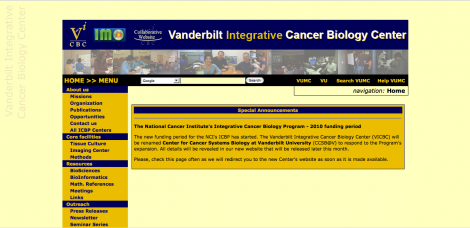 The Vanderbilt Integrative Cancer Biology Center (VICBC) was created in 2004, funded by a 5-yr grant from the National Cancer Institute. This multi-disciplinary Center featured a team of scientists at different locations. The VICBC website was essential to the success of the Center. We created a three-layer interface: 1) the public interface with press releases, news and events, and tutorials, 2) the scientific interface with methods, projects and aims, and 3) the intranet interface where the Center's scientists and collaborators can exchange information and data, and which was implemented using Drupal In 2009, the Center's fundings were renewed for an additional 5-yr period, but with a new direction, the VICBC was transformed into the Center for Cancer Systems Biology at Vanderbilt (CCSB@V). |